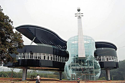 Повернув за угол, путешественники очутились в Музыкальном переулке, где все дома были построены в виде каких-нибудь музыкальных инструментов. Один дом был в виде пианино, другой — в виде рояля, третий — арфы, четвёртый — аккордеона, пятый — барабана.